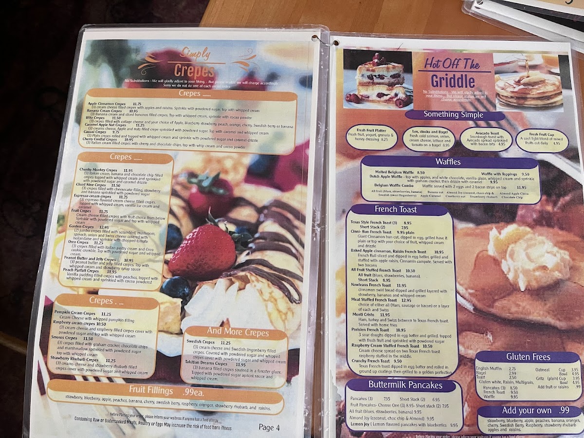 The menu features a range of familiar favorites like over easy eggs paired with home fries, as well as more distinctive options such as the Mexican omelette or pumpkin pie crepes. Coffee is a steady companion here, perfect for morning conversations or a quiet break from the day’s pace.